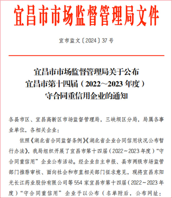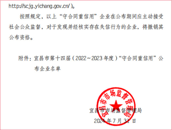 近日,在湖北省市场监督管理局和宜昌市市场监督管理局公布的湖北省第十七届 (2022—2023年度)“守合同重信用”企业及宜昌市第十四届(2022-2023年度)“守合同重信用”企业名单中,我公司再度被评为省、市两级“守合同重信用”企业,这是我公司连续第九年蝉联湖北省省级“守合同重信用企业”荣誉称号。