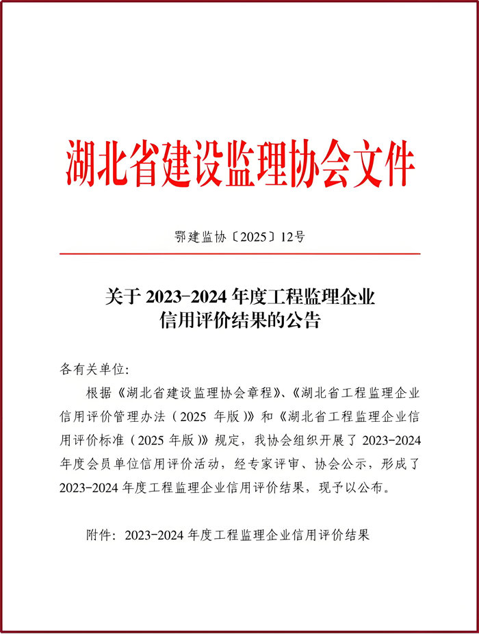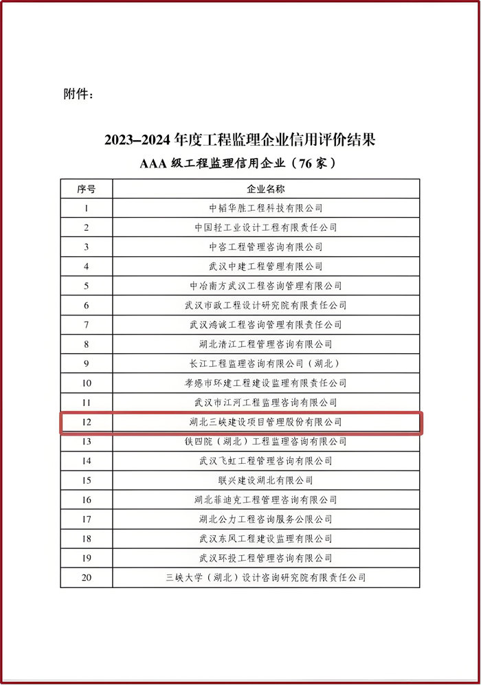 热烈祝贺完美平台荣获湖北省建设监理协会2023-2024年度工程监理企业信用评价结果 AAA级工程监理信用企业!